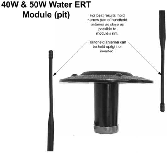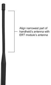In the following illustrations, it is important to note that the narrowest part of the handheld’s antenna should be positioned closest to, and aligned parallel with, the ERT module’s antenna.