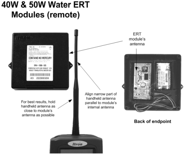 Important! 100W series ERT modules are datalogging devices, capable of long-range transmission of up to 40 days' worth of historical hourly meter readings (interval data). However, FDM does not support long-range reads on 100W series modules. For FDM to retrieve either historical or current meter readings from 100Ws, the mobile device running FDM must be less than 50 feet from the ERT module.