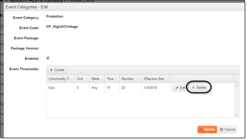 On the Analytic Events page, click Edit for the Event Category and Event Code combination you want to delete a threshold from.