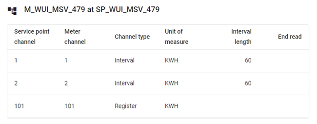 The Channels table provides meter channel, unit-of-measure (UOM), interval-length, and end-read details for this service point (Service Point A). Scroll down to view all rows.