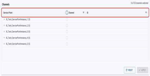 ) to add the selected service points.The Channels table appears with the data for the selected service points.