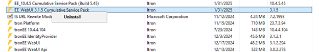 From the list of installed programs, right-click IEE_WebUI_3.1.5_Cumulative_ServicePack and select Uninstall.