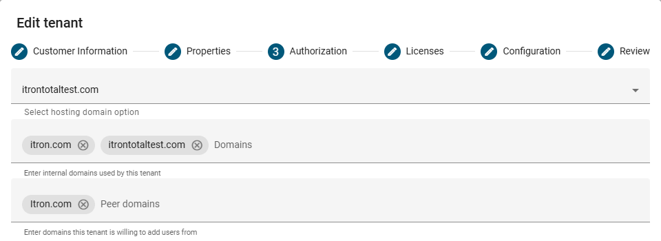When you are done editing the tenant's authorization, either select another section from the top of the Edit tenant dialog or select the Review section and continue from Step 4 on Editing tenants.