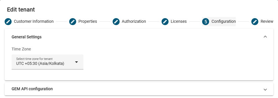 When you are done editing the tenant's configuration, either select another section from the top of the Edit tenant dialog or select the Review section and continue from Step 4 on Editing tenants.
