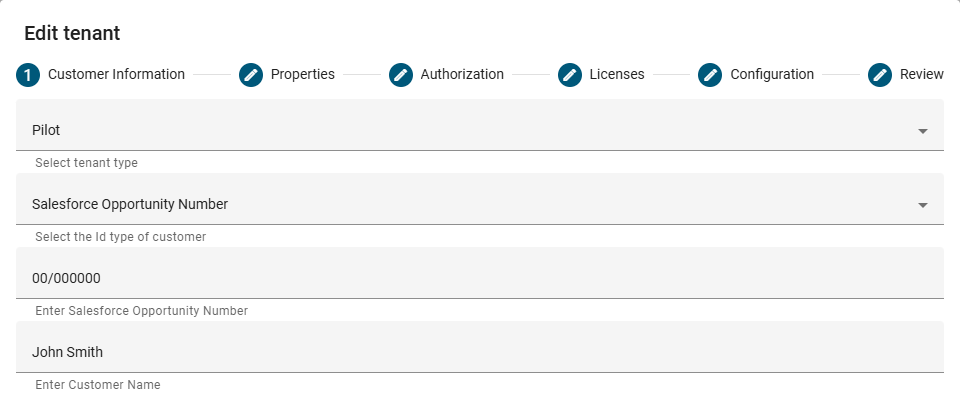 When you are done editing the customer information, either select another section from the top of the Edit tenant dialog or select the Review section and continue from Step 4 on Editing tenants.