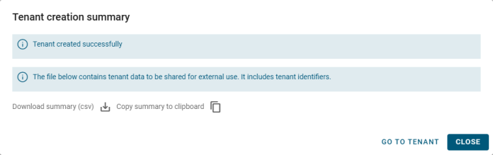 After clicking Complete, the Tenant creation summary appears. If the tenant creation completed but contains warnings, a yellow warning message appears at the top of the dialog. Click the Copy icon (
