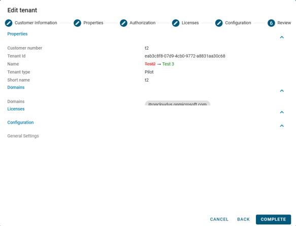 On the Review step, check the tenant information and all of your changes. New values appear in green text. Edited and removed values appear in red text with strike-through lines. To make changes, click Back to navigate to previous steps.
