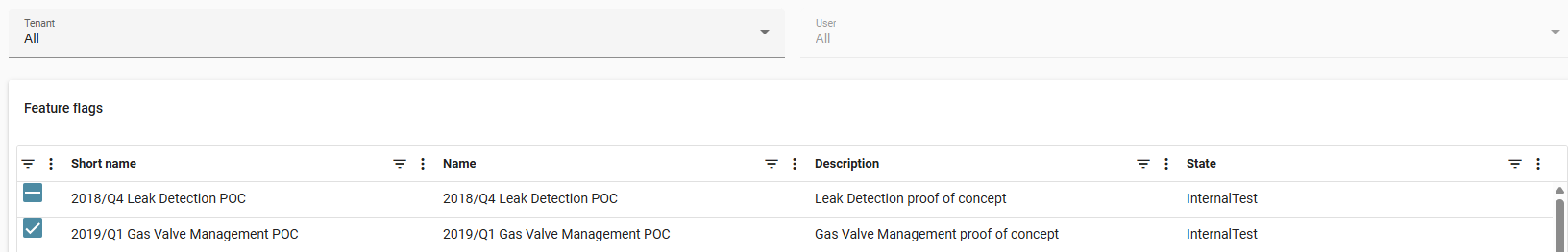 The Feature Flags page contains a Feature flags panel, which lists all features available within the environment, a Tenant dropdown, which lists all tenants within the environment, and a User dropdown, which lists all users inside the tenant selected in the Tenant dropdown.