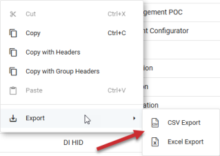Any of the cards on the Tenant Permissions page can have their data exported as a CSV file or an Excel file. To do so, right-click inside the table, hover the cursor over Export, and click either CSV Export or Excel Export.
