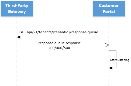 The customer portal will make a call to the Third-Party Gateway to get the connection string of the response queue. Every REST response from the EAC is sent to this service bus queue. The customer portal has read-only access to the response queue. The customer portal listens for responses from this queue.